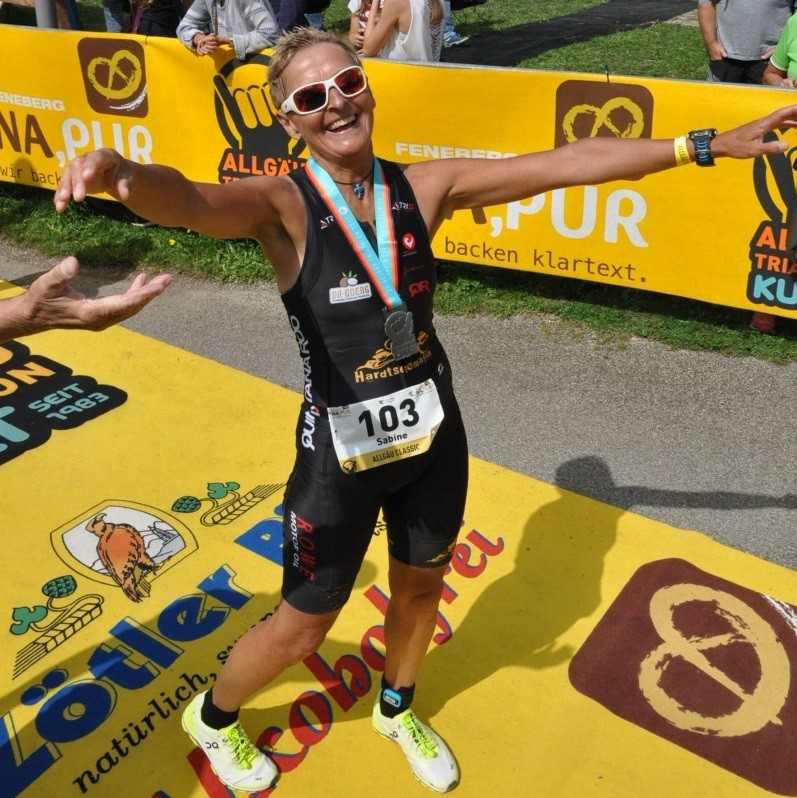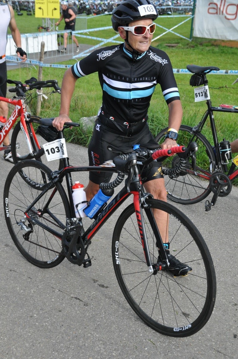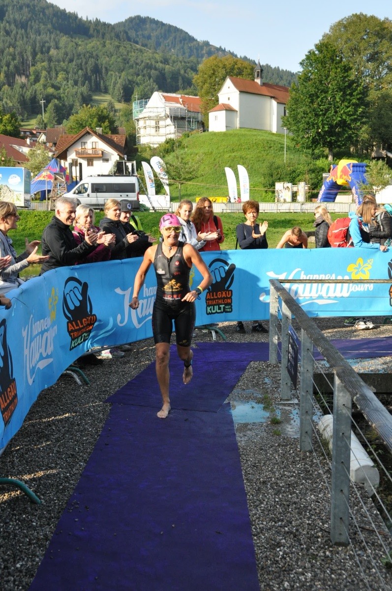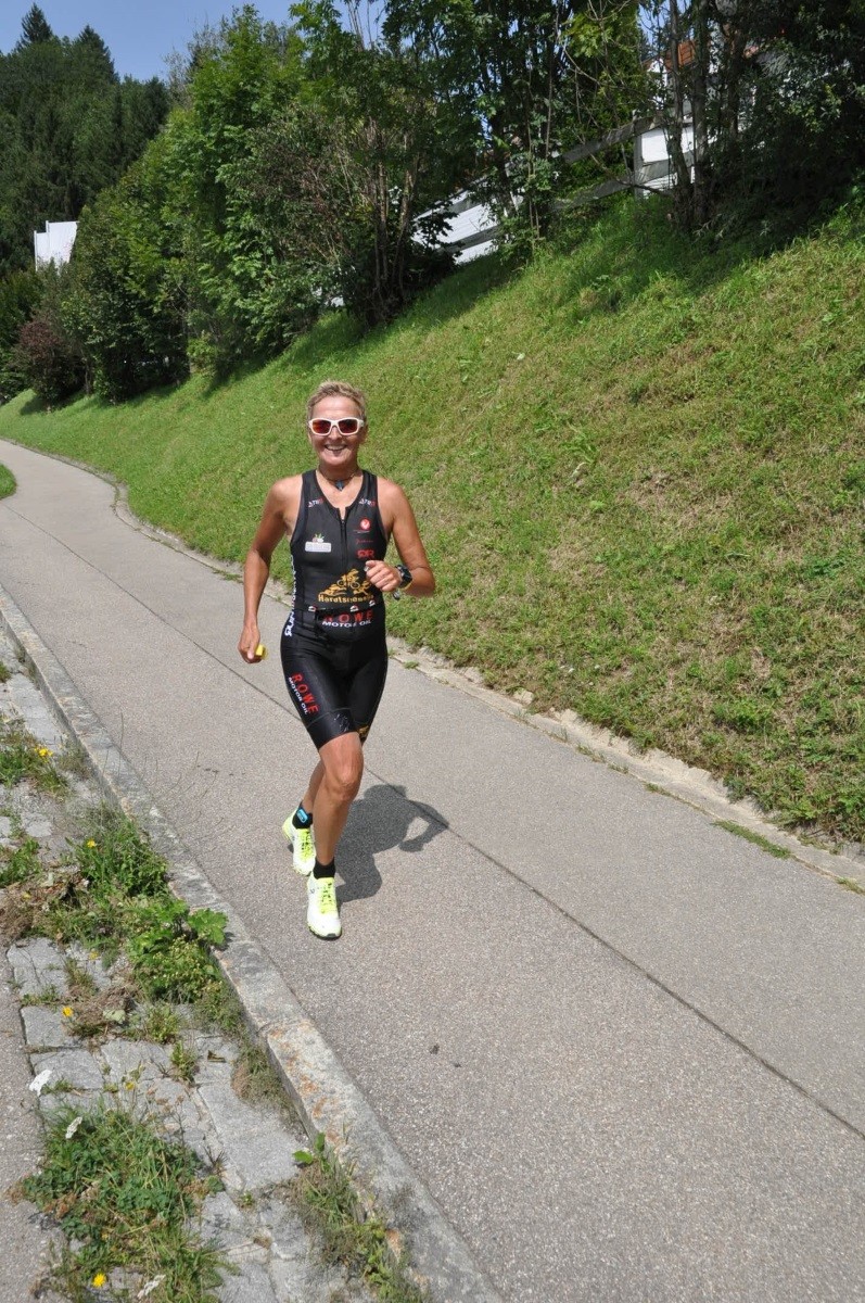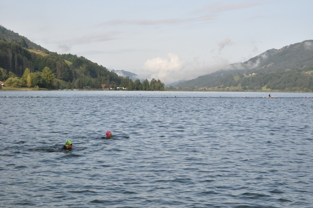 Pünktlich um 7:30 Uhr stand ich am Schwimmstart immer noch mit mir hadernd, ob ich den Neo anziehen soll oder nicht. Die Temperatur des großen Alpsees wurde in dieser Sekunde mit 19,9 Grad angegeben. Ich tauchte den Finger ins Wasser und dachte mir, das ziehst du ohne Neo durch. Brustschwimmen geht nun einmal deutlich besser ohne Neo. Ich überlegte nicht mehr lange, verabschiedete mich und ging auf den Steg zum Start. Ich war die Einzige der „Mitteldistanzdamen“, die ohne Neo schwamm. Aber komischerweise sah mich niemand mitleidig an wie noch vor 2 Monaten in Heilbronn. Der Startschuss fiel und ich stieg ins Wasser. Es lief. Es lief so wie meine Brustschwimmerei halt lief. Bis Kilometer 1 war alles gut, doch dann begann die Kälte in mir hoch zu steigen. Schön langsam kamen auch noch die schnellen Männer, die 15 min nach uns ins Wasser durften. Ab jetzt wurde es ein Kampf ums Durchkommen. Ich fror, schluckte Wasser und kämpfte. Dann ein kurzer Landgang und noch einmal reinspringen und 500 Meter schwimmen. Ich wollte nur noch an Land und war gespannt, was da noch alles mit mir passieren würde. Eine Frau war sogar noch hinter mir, so merkte ich irgendwann.