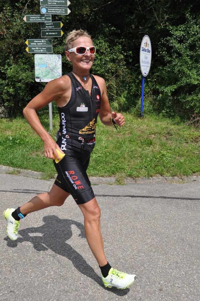 Runde 2 lief besser, auch ein bisschen schneller, aber wie gesagt nicht Vollgas 😉 Wechselzone rückte immer näher, ich entdeckte Tom und versuchte, ein möglichst entspanntes Gesicht zu machen, dem die Anstrengung nicht anzumerken war. Der zweite Wechsel ging auch besser, ich musste ja nur noch in die Laufschuhe schlüpfen. Nun sollte meine Lieblingsdisziplin beginnen, doch seit vier Wochen plagten mich Wadenschmerzen, so dass ich kaum trainieren konnte. Und ob Aquajogging das alles so richtig ersetzen konnte, sollte sich zeigen. Jedenfalls lief ich sehr vorsichtig, immer mit den Gedanken in der rechten Wade. Ich redete mir ein, dass es zumindest bis Kilometer 10 nicht richtig weh tun sollte, ab dann würde ich das Ding auch humpelnd ins Ziel bringen. Aber die Wade hielt. Sie hielt bis zum Ende, auch wenn ich vorsichtig damit umging 😉 Die Laufstrecke im Allgemeinen sieht im Profil super easy aus, ist sie aber nicht. Es ist ein ständiges leichtes Auf und Ab, was schon ordentlich an den Kräften zehrt. Zwischen Kilometer 12 und 13 kam dann er berühmt berüchtigte Kuhsteig. Ca. 150 Meter steil bergauf, kaum zu laufen und eben ein entsprechender Untergrund 😉