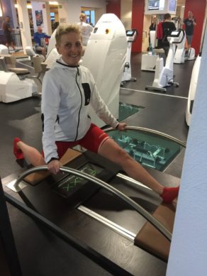 Meistens trudeln dann die ersten Trainingskollegen aus der Spinningstunde ein und wir machen gemeinsam noch verschiedene Übungen auf dem freien Trainingsplateau. Auch hier gehe ich vor wie bei einem Zirkel, beginne mit Beinbeuger, wechsle zum Zugseil, danach Beinstrecker, Übung der seitlichen Bauchmuskeln, Lieblingsübung Beinrückseiten, Ausfallschritte mit Hanteln und Planks. Pro Übung sind es wieder 10 Wiederholungen mit 3 Serien. Nach den Kraftübungen genieße ich meist die Dehnübungen an den Flexx-Geräten.