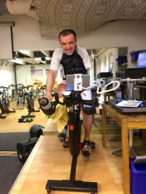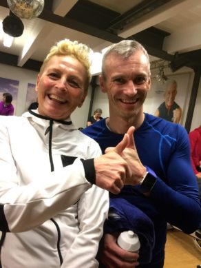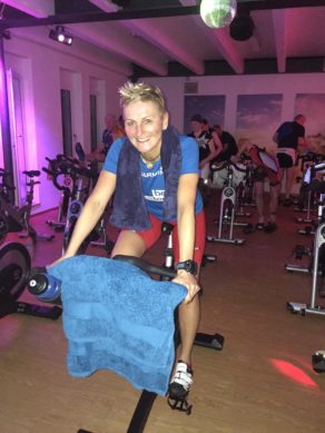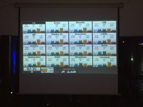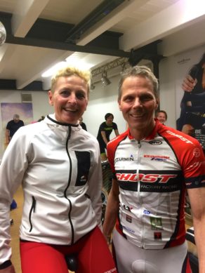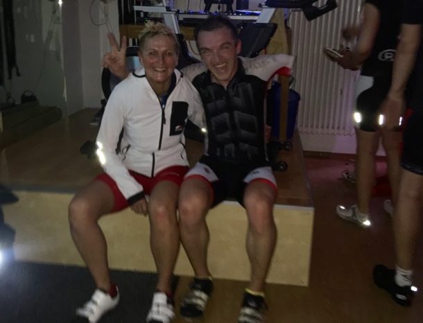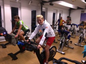 Wolfi Stöckl, der die Stunde leitet, verteilt noch Polar Sensoren an diejenigen, die sich über das Polar GX seine Werte genau über Beamer anzeigen lassen möchte. Um 19 Uhr geht’s dann los. In der heutigen Stunde fahren wir 5 Intervalle, darunter auch einbeiniges Fahren, ein Bergintervall über 20 Minuten, Intervalle mit verschiedenen Kadenzen und Sprints. Nach 90 Minuten geht die Stunde zu Ende und unter den Rädern haben sich überall Pfützen gebildet. Es folgt ein kurzes Dehnprogramm von 5 Minuten und dann geht´s ab zum Duschen und in die Sauna.