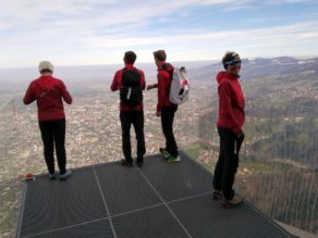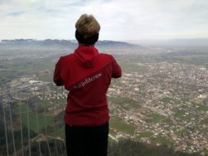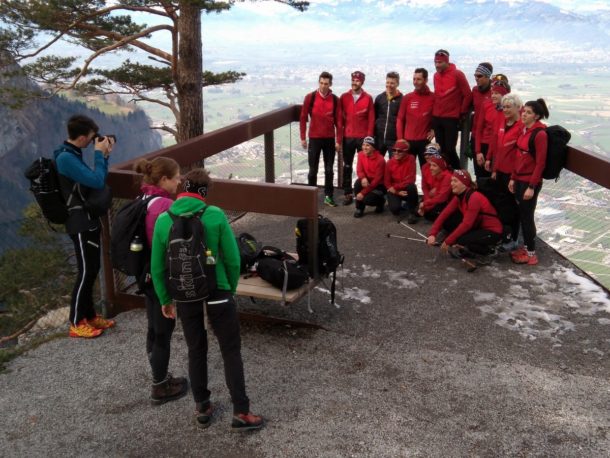 Nach kurzer Begrüßung im Skinfitcafé ging es auch schon los mit der von Jessica und Katrin organisierten Bergwanderung. Zum Glück hatte ich die Bergschuhe eingepackt, denn der Regen der letzten Tage machte den Untergrund doch ganz schön rutschig. Schön war es aber anzusehen, wie wir da alle in unseren roten Teamjacken auf den Vorarlberger Pfaden unterwegs waren. Erstes Ziel und Zeit für Fotos war die Aussichtsplattform am Karren, dem Hausberg von Dornbirn. Hier hat man einen tollen Blick vom unteren Rheintal bis zum Bodensee. Auch Teile der Strecke vom Dreiländermarathon sind zu erahnen.
