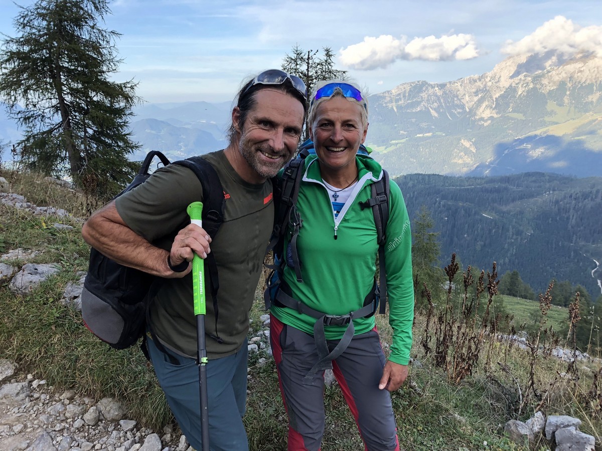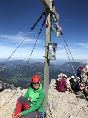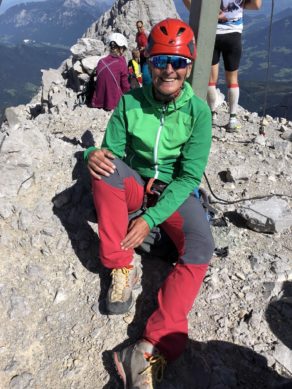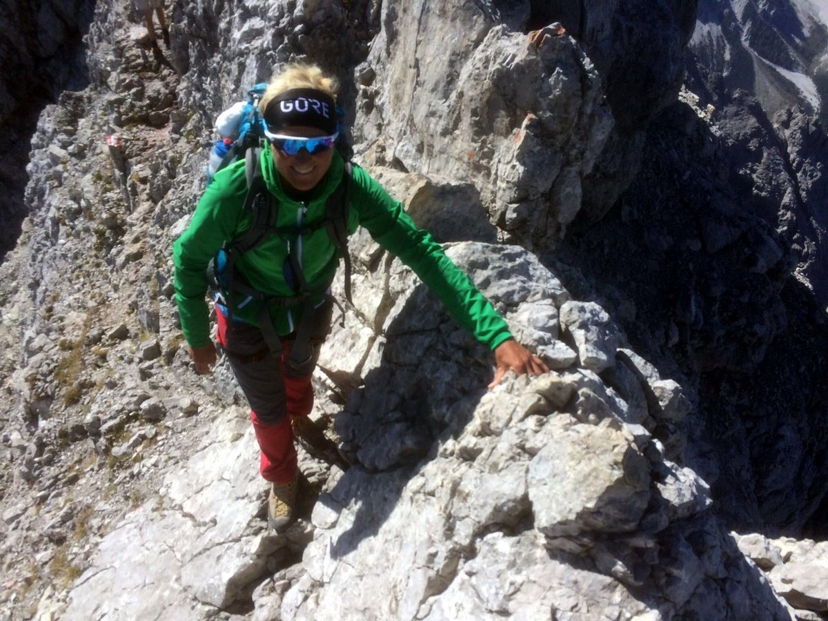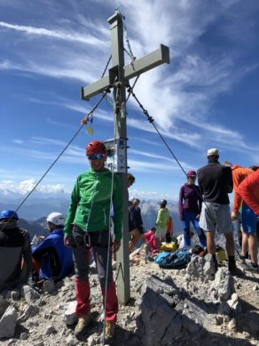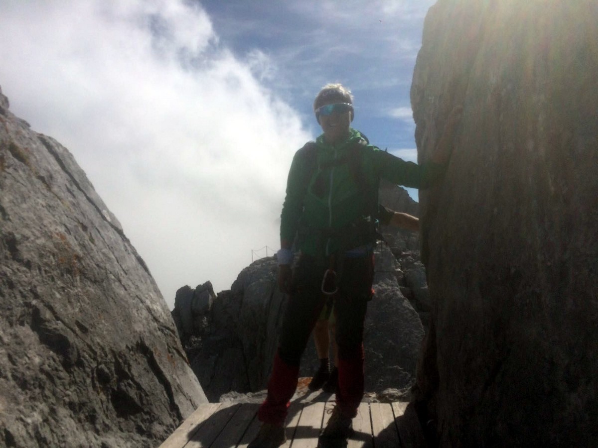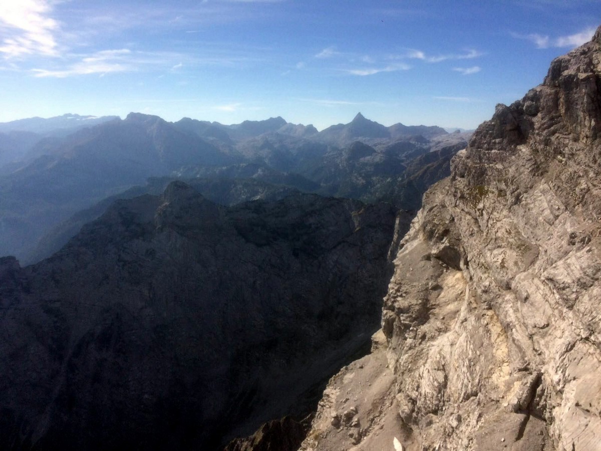 Ich fasste mich wieder und weiter ging es bis zur berühmten orangefarbenen Biwakschachtel der Ostwand. Ich inspizierte sofort die Notunterkunft. Ungefähr 6 Schlafsäcke hingen hier aufgereiht und können von jedermann benutzt werden, der hier eine längere Pause oder sogar eine Übernachtung nötig hat. Ich suchte nun auch noch den Geocache, der hier versteckt ist und nach kräftiger Stärkung ging es dann aber wieder weiter. Die schwierigsten Stellen der ganzen Ostwand warteten auf den letzten Metern bis zur Südspitze. Ein letztes Mal wurde angeseilt und noch einmal muss ich erwähnen, dass es nicht die schwierigen Kletterstellen waren, die nun zu schaffen machten. Ich bereits 6 Stunden in der Wand und die Kräfte schwanden. Und ich gebe auch zu, dass ich manchmal lieber nicht den Blick nach unten warf. Den 5 Meter Pfeiler überwand ich dann aber auch und bis ich mich versah, stand ich auf der Südspitze. Hier war heute reges Treiben angesagt. Viele nutzten das schöne Wetter für die Watzmannüberschreitung. Sie waren über das Hocheck und die Mittelspitze teilweise mittels Klettersteig auf die Südspitze gestiegen. Südspitze ist demzufolge das Ziel der Ostwandbegeher und der Watzmannüberschreiter. Ist man an der Südspitze angekommen, geht der Weg üblicherweise über das Wimbachgrieß nach unten. Wir hingegen entschieden uns dafür, nun auch noch die Überschreitung in umgekehrter Richtung anzuhängen. Diese hatte ich 2014 schon einmal gemacht und hatte sie als absolut einfach in Erinnerung. Heute allerdings, nach 7,5 Stunden Klettern in der Ostwand, war ich dann doch schon etwas geschwächt. So hangelte ich mich etwas träge zur Mittelspitze und dann weiter zum Hocheck. Ab da ging es nur noch bergab, allerdings auf grobem Kies und teilweise losen Felsen. Meinen Oberschenkeln gefielen diese letzten Meter überhaupt nicht. Lange bevor man unten ist, sieht man das Watzmannhaus und der Gedanke an ein kühles Bier lässt einem das Wasser im Munde zusammenlaufen. Nach 12 Stunden war ich am Watzmannhaus angelangt. Und bevor ich nun noch zur Wimbachbrücke abstieg, stieß ich bei einem kühlen Bier mit meinem Bergführer Hans an. Er war es auch, der wusste, dass an diesem Tag Alex Huber (einer der beiden HuberBoum) noch auf das Haus kommen würde, um morgen mit Gästen die Watzmannüberschreitung zu machen. So war es also nicht auszuschließen, dass ich auf meinem Abstieg den Alex treffen könnte. So geschah es dann auch tatsächlich, zuerst entdeckte ich die Kameramänner und dann kam auch schon er hochgestapft. Und natürlich war er bereit für ein Foto mit mir 😉