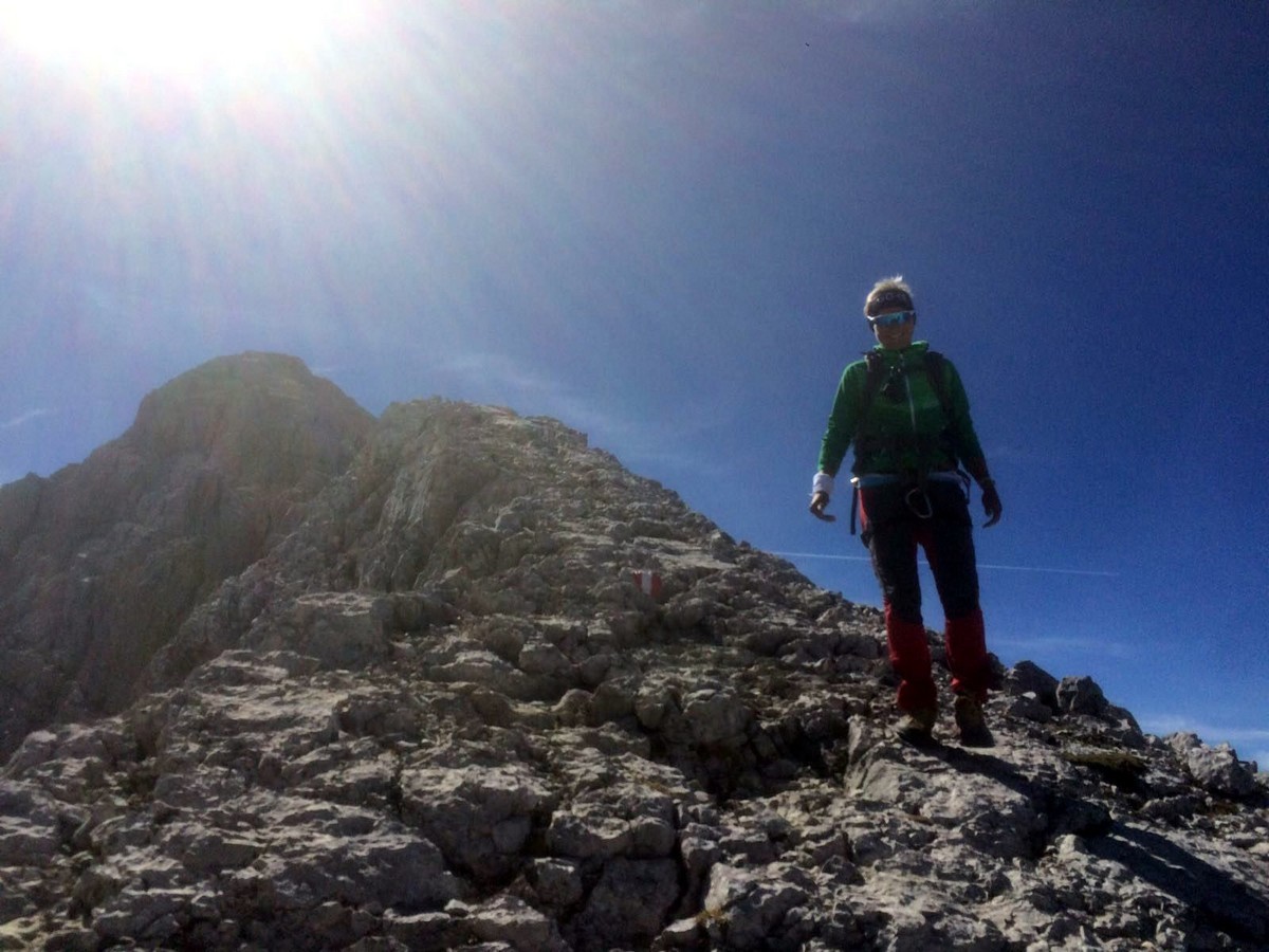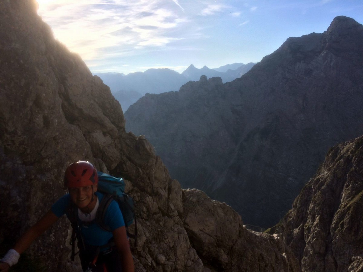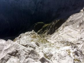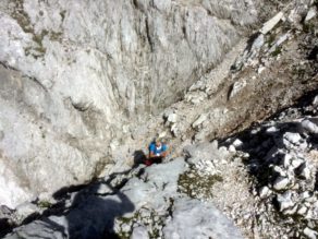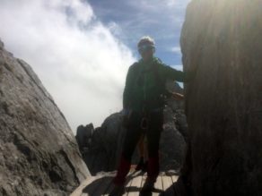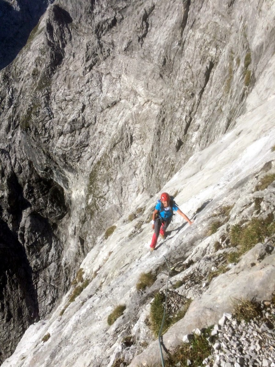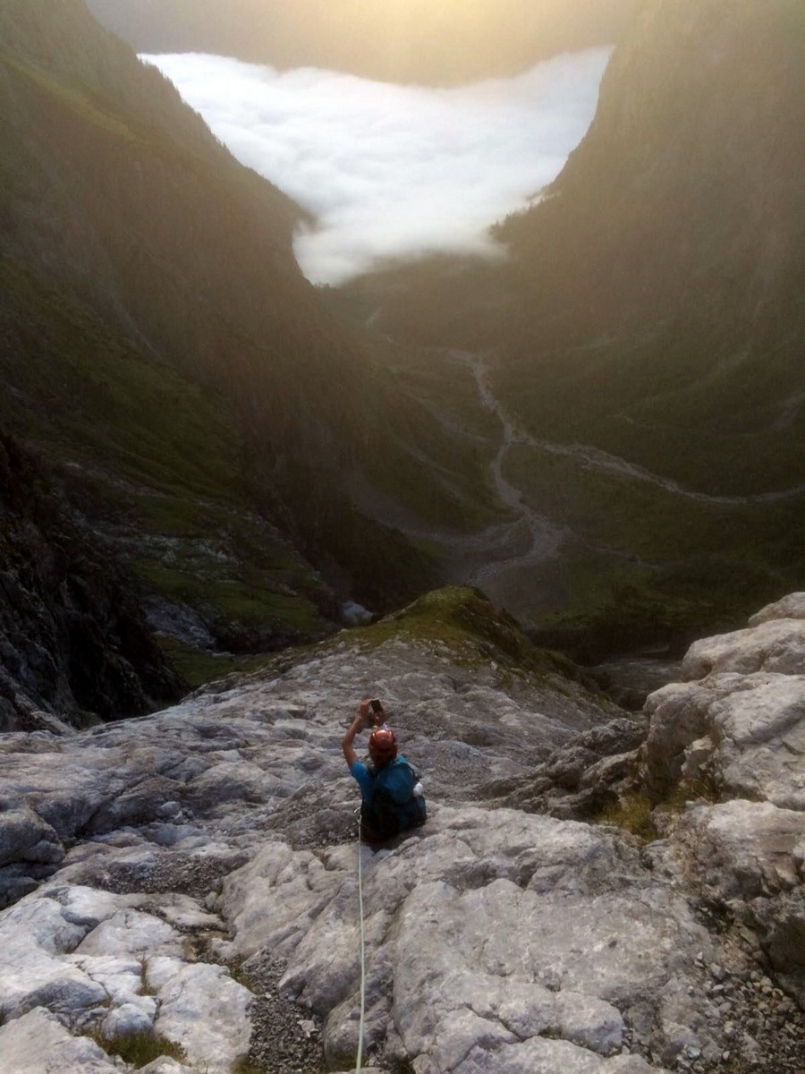 In der Früh um 4:30 Uhr brachen wir auf, damit wir ungefähr bei Anbruch des Tages das Schuttkar erreicht hatten. Mit Stirnlampe ausgerüstet ging es über Waldwege und später steiler durch sogenanntes Schrofengelände bis zum Schuttkar. Nun begann einfache Kletterei im zweiten Grad, aber auch einige schwierigere Stellen waren dabei. Da ich aber noch gut bei Kräften war, ging es noch relativ flott voran. Bald erreichten wir auch schon die Schlüsselstelle Wasserfallplatte und nach mehreren Seillängen Plattenkletterei kam ich doch ordentlich ins Schwitzen. Nach diesen schwierigen 100 Metern ging es weiter mittels Kletterei, jedoch ein wenig einfacher, bis zur Gipfelschlucht.