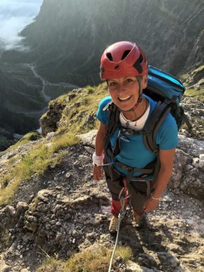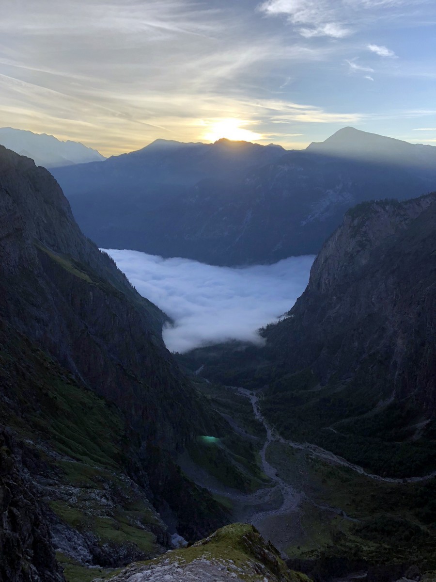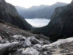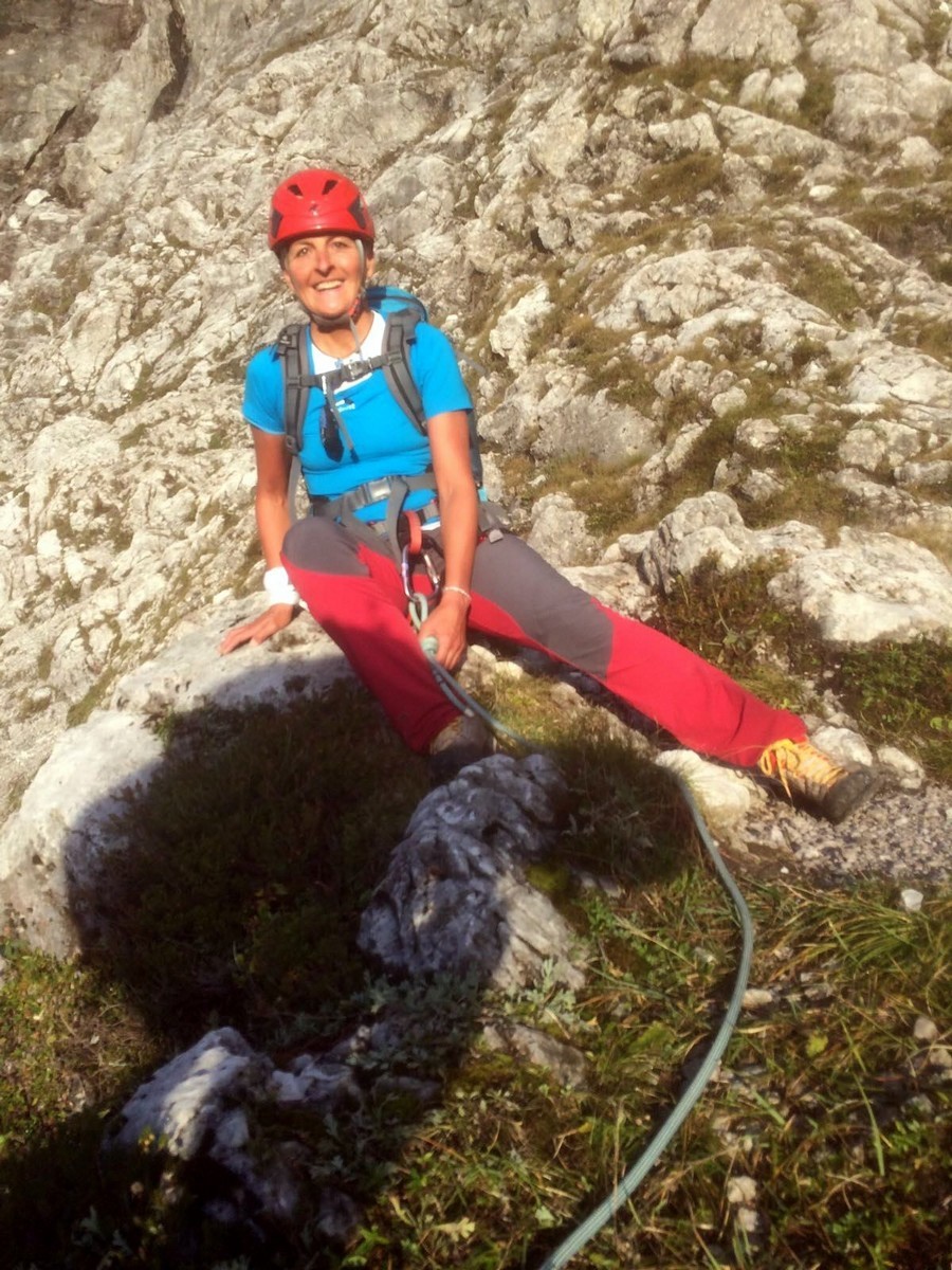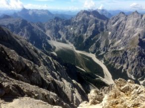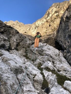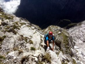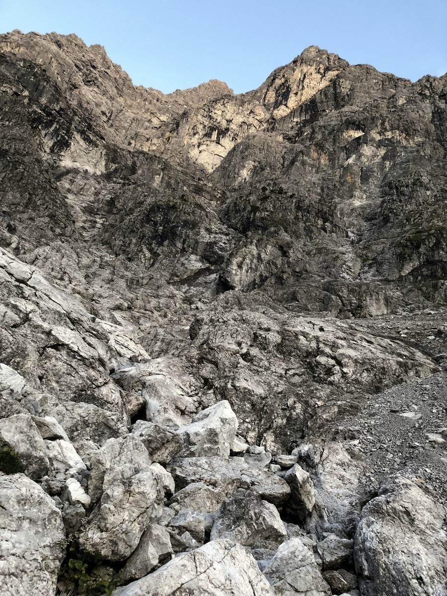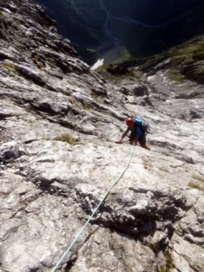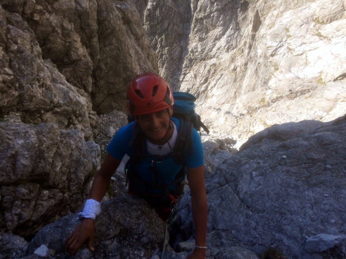 In der Früh um 4:30 Uhr brachen wir auf, damit wir ungefähr bei Anbruch des Tages das Schuttkar erreicht hatten. Mit Stirnlampe ausgerüstet ging es über Waldwege und später steiler durch sogenanntes Schrofengelände bis zum Schuttkar. Nun begann einfache Kletterei im zweiten Grad, aber auch einige schwierigere Stellen waren dabei. Da ich aber noch gut bei Kräften war, ging es noch relativ flott voran. Bald erreichten wir auch schon die Schlüsselstelle Wasserfallplatte und nach mehreren Seillängen Plattenkletterei kam ich doch ordentlich ins Schwitzen. Nach diesen schwierigen 100 Metern ging es weiter mittels Kletterei, jedoch ein wenig einfacher, bis zur Gipfelschlucht.