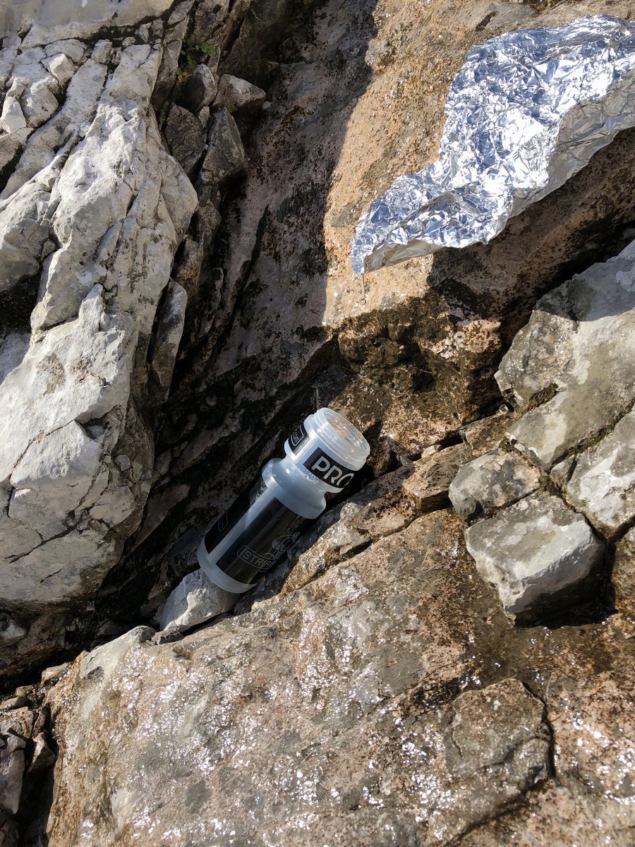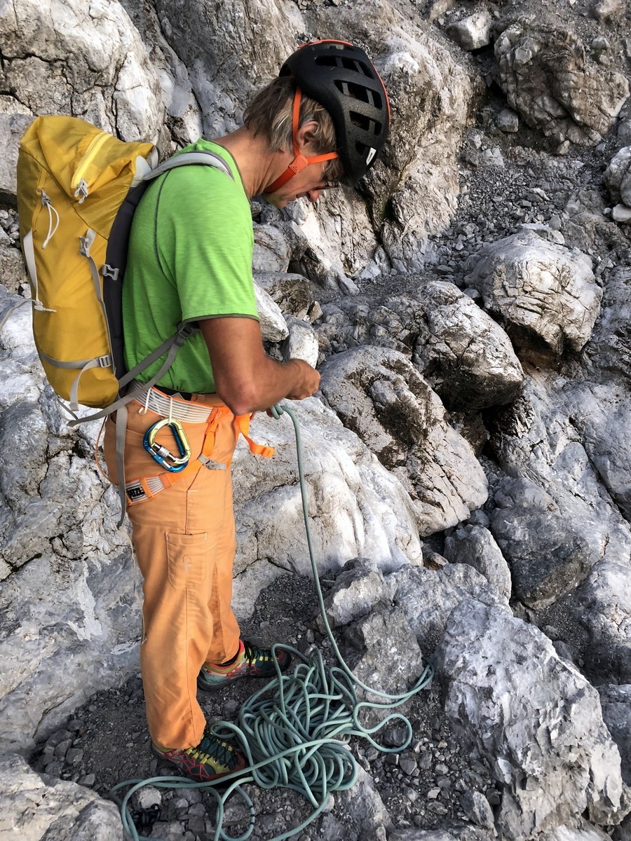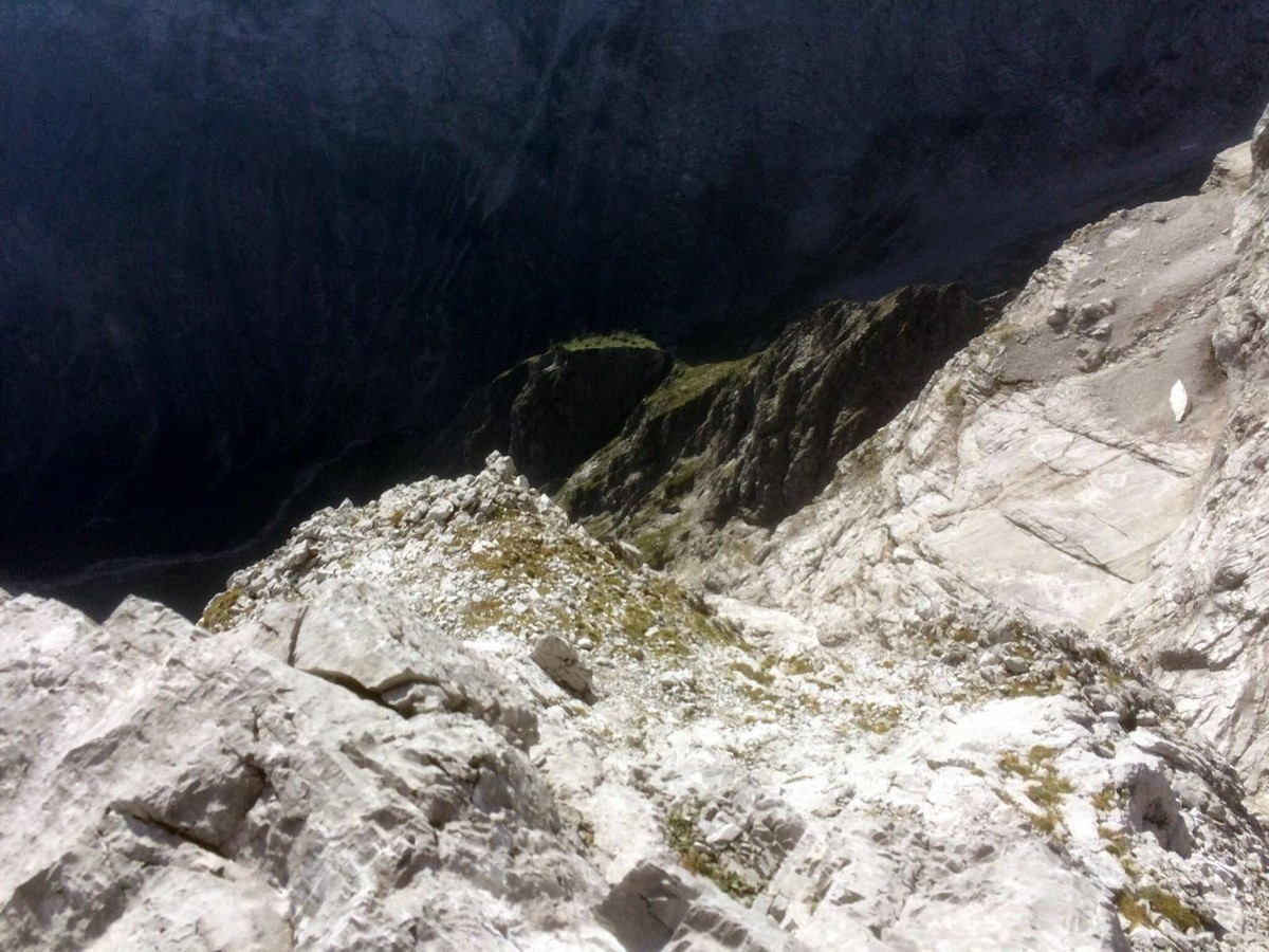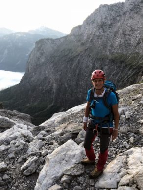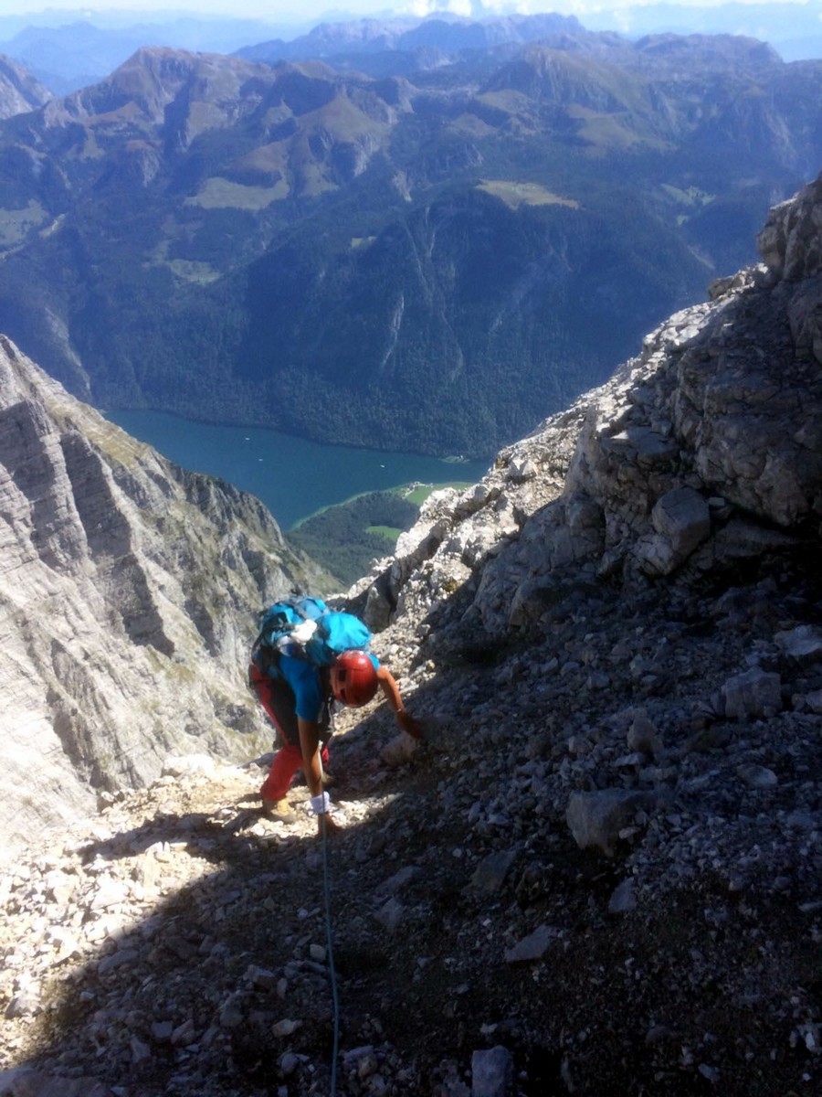 Hier machten wir erste Pause und Hans demonstrierte mir, wie man aus diesem Rinnsal trotzdem rasch seine Wasservorräte auffüllen kann. Nach der Pause folgte einfache Kletterei ohne Seil. Die Ausblicke waren gigantisch und der Nebel über dem Königssee verzog sich. Auch wenn es sich hier nur um leichte Kletterei handelt, so machten sich doch erste Ermüdungserscheinungen breit. Hans ermunterte, doch mehr meinen Beinen zu vertrauen und die Arme zu schonen. Eine Tatsache, die ich aber auch zuhause an der Kletterwand schon öfters zu hören bekam 😉 Aber es nutzte nichts, ich wollte ja nach oben. Zu dieser Zeit hörten wir auch, dass unter uns der Rettungshubschrauber anrückte. Kopfkino lief ab und erschwerte mir kurzzeitig zügiges Klettern. Später erfuhr ich, dass ein 56 jähriger Bergsteiger 50 Meter in die Tiefe stürzte, aber überlegte.