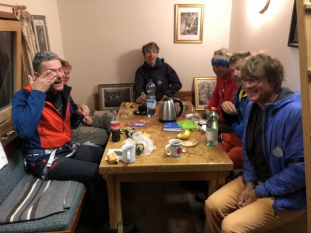 Angekommen gab es in dem Gasthaus noch eine Brotzeit und dann bezogen wir auch schon das Ostwandlager. Da es sich rund um den Königssee um einen Nationalpark handelt, ist es niemandem gestattet, in St- Bartolomä zu übernachten. Auch das Gasthaus darf keine Gäste aufnehmen. Lediglich den Begehern der Ostwand wird erlaubt, im Ostwandlager zu schlafen. Außer uns waren noch 3 weitere Bergführer mit ihren Schützlingen vor Ort und im Nebenraum noch etwa 15 weitere Ostwandaspiranten.
