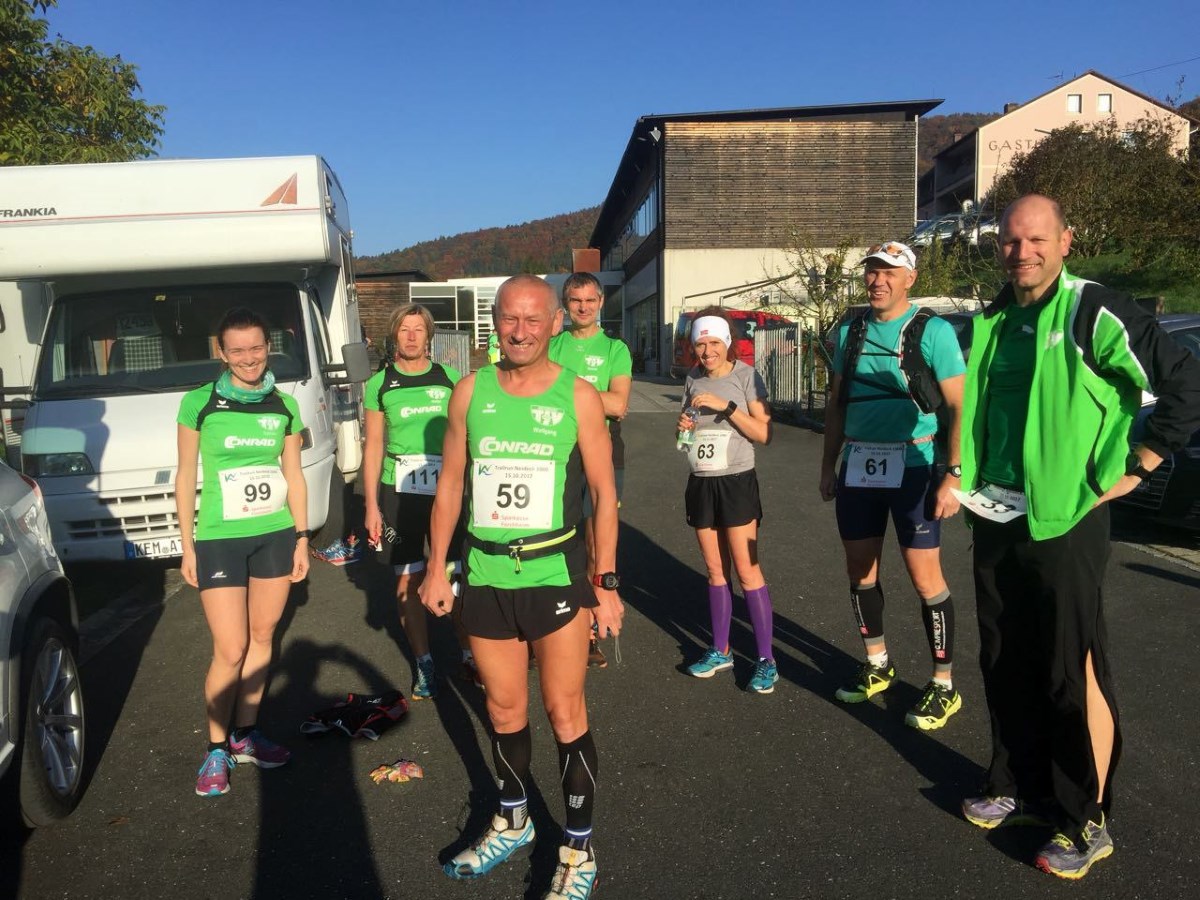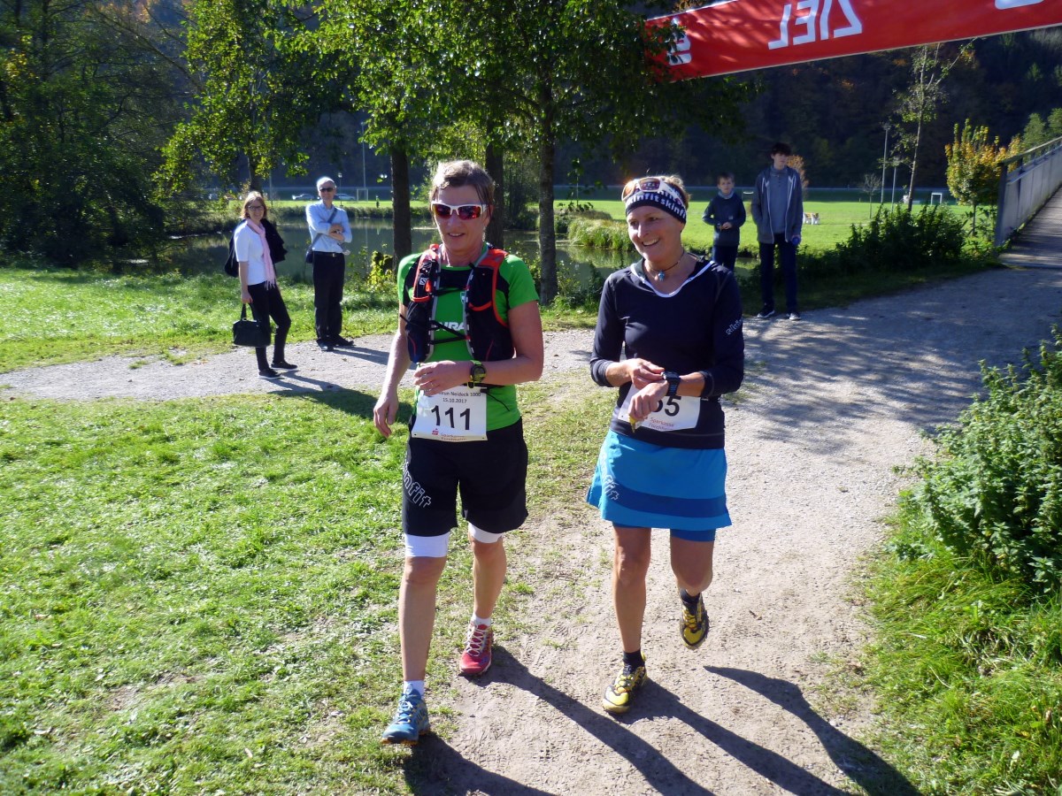 Trotz wenig Lauftraining war ich überrascht, wie gut es doch voranging. So manche(r) Läufer/in konnte überholt werden. Nachdem wieder ein langer, anstrengender Anstieg bei km15 bewältigt war, war ich echt erleichtert, die meisten Höhenmeter hinter mich gebracht zu haben. Spätestens jetzt war ich erleichtert, wenn es einigermaßen eben dahin ging, denn auf den letzten Kilometern merkte ich bei jeder kleinen Steigung meine brennenden Oberschenkel. Noch 2 km – ein Blick auf die Uhr – die 3 Stunden könnten drin sein! Ich sehe ein kleines Schild: “1km“, gleich ist es geschafft. Der Stadionsprecher ist auch schon zu hören. Ein letzter schmaler Pfad führt uns hinab zur Straße und ins Ziel. 3 Std. 5 min. waren wir gemeinsam unterwegs in wunderschönem, teils anspruchsvollem Gelände. Und das, wovor wir etwas Bammel hatten, ist nicht passiert: Wir haben uns nicht verlaufen. Die Strecke war durchwegs sehr gut ausgeschildert.