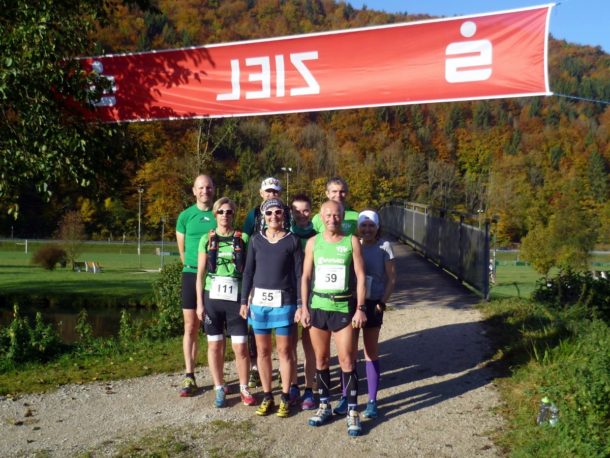 Der Trail verlief auf teils schmalen Pfaden durch die herbstlich gefärbten Wälder. Es wurde nie langweilig, ein ständiges Auf und Ab, auch mit steilen Passagen, wo man nur gehen konnte. Wieder merkte ich, dass ich downhill große Schwächen habe. Obwohl ich vor ein paar Wochen an einem Trailcamp im bayrischen Wald teilgenommen habe, und dort nützliche Tipps für das Bergablaufen erhalten habe und auch üben konnte, fehlte es mir an Mut und Technik, es einfach mal laufen zu lassen. Da sich Sabine bergab noch unsicherer bewegt als ich, haben wir uns abgewechselt. Downhill lief ich voran, und bergauf sie, da Sabine hier die Bessere war.